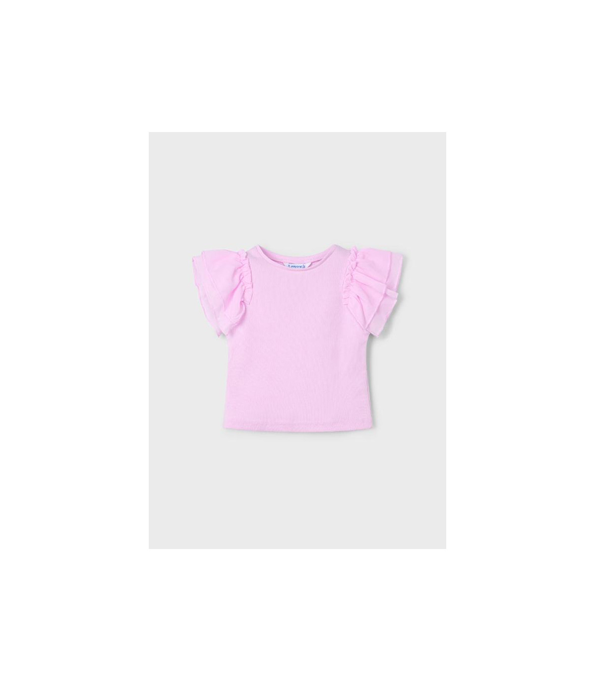 Camiseta de Mayoral con cuello redondo con volantes de gasa en las mangas. Tejido tipo punto canalé.