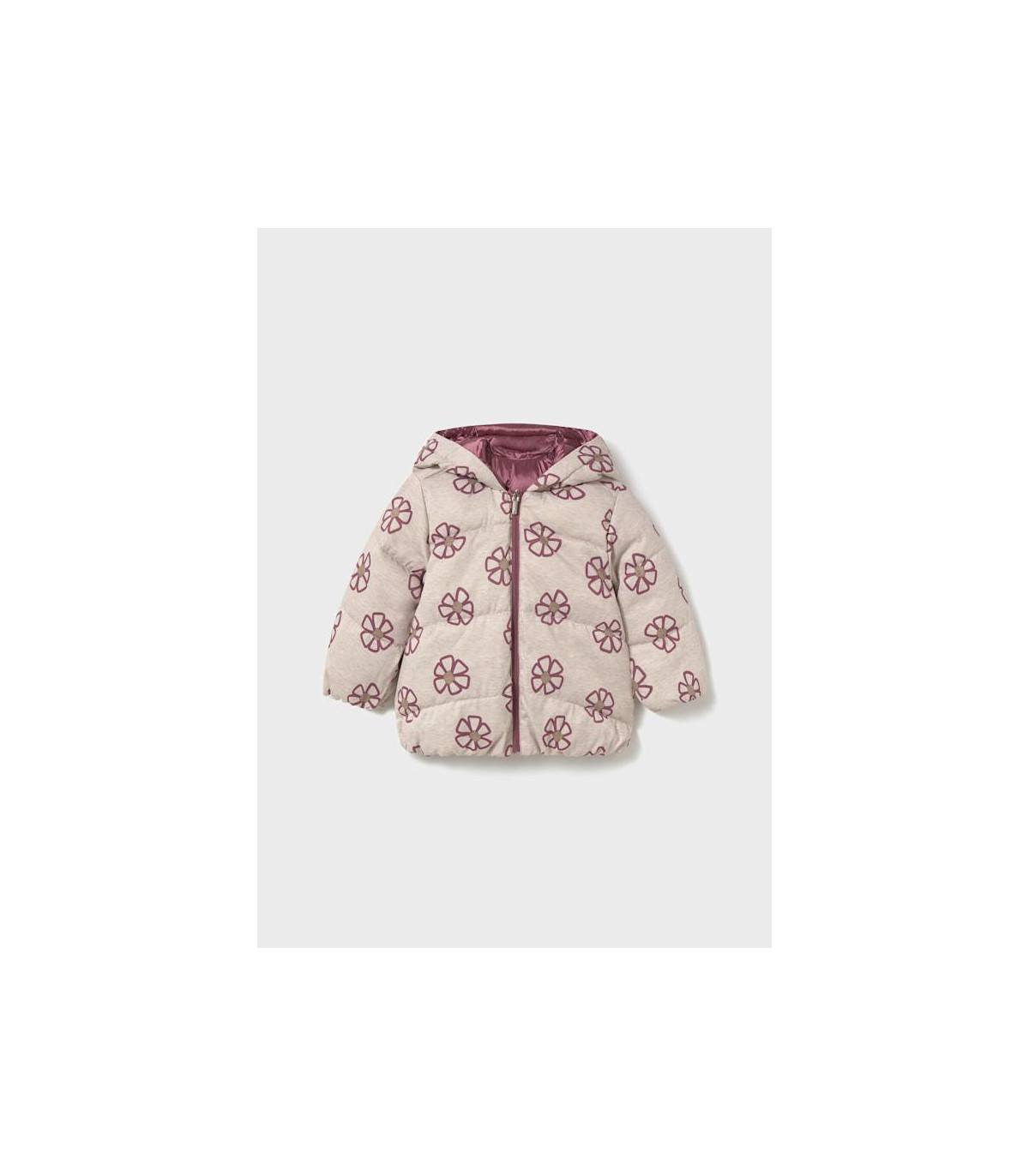 Chaquetón de Mayoral reversible estampado. Cuello con capucha y cierre central delantero con cremallera.