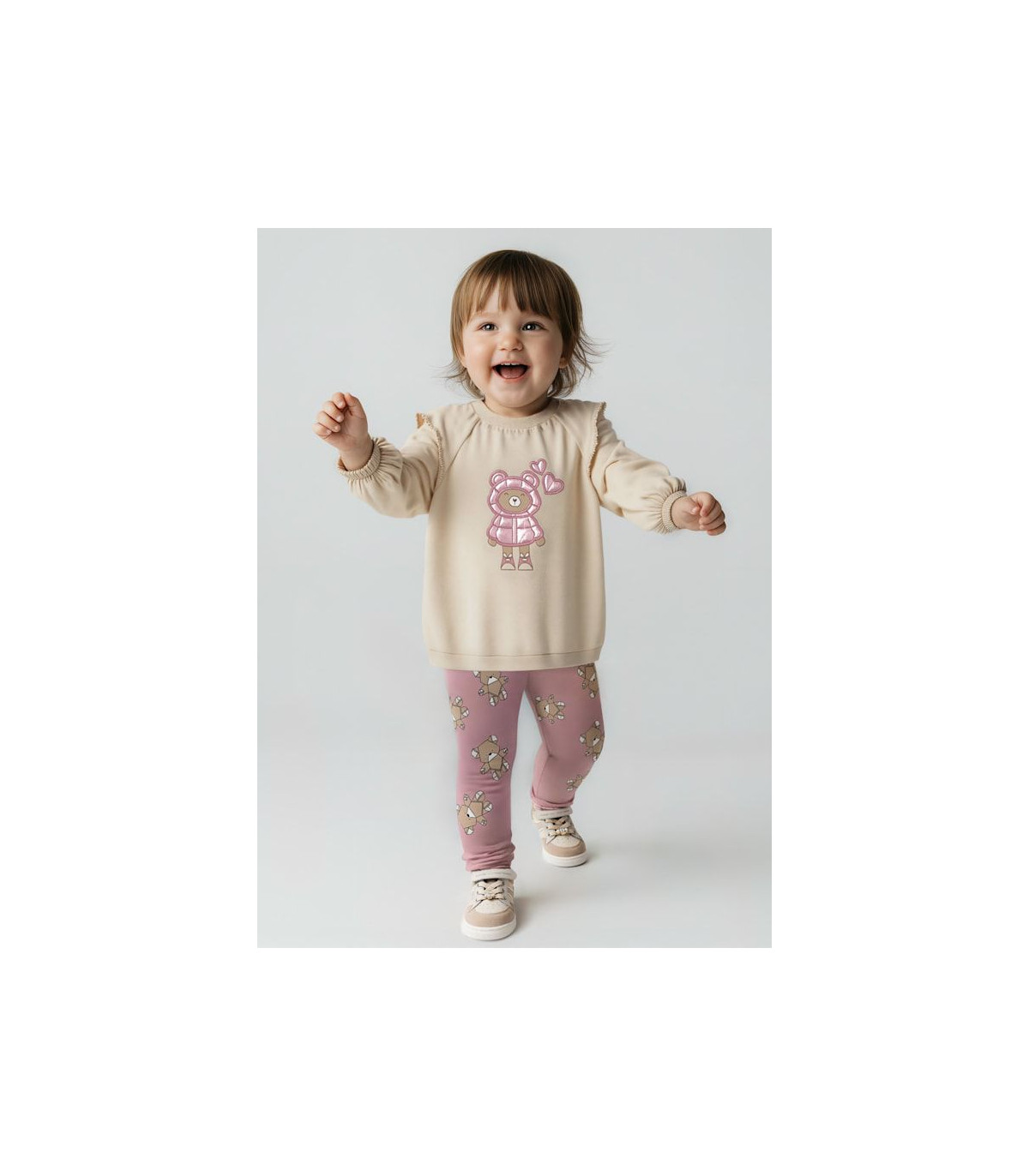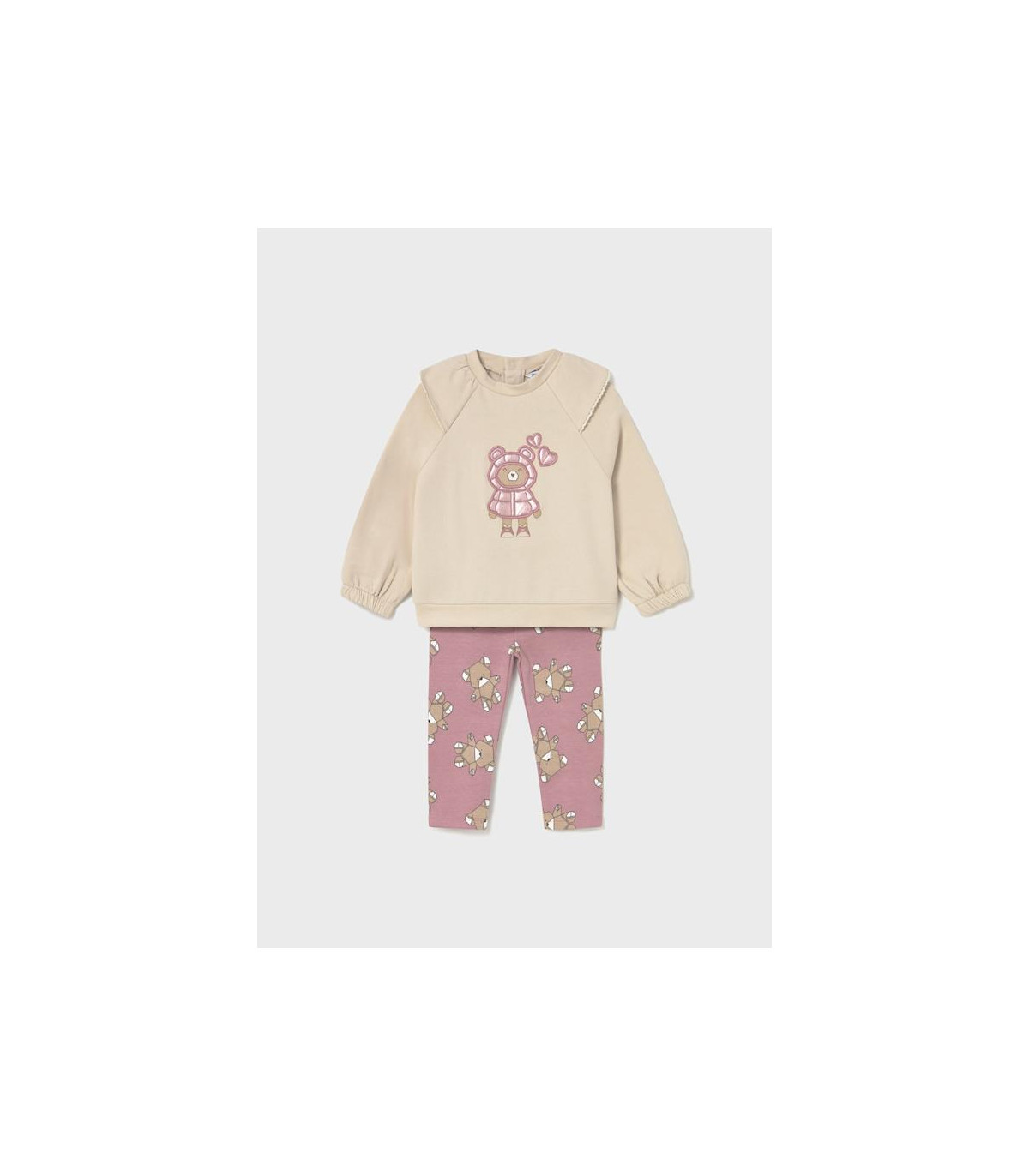 Conjunto de Mayoral compuesto por dos prendas. Sudadera con cuello redondo con cierre con botones a presión en la parte posterior. Pantalón tipo legging con cintura elástica.