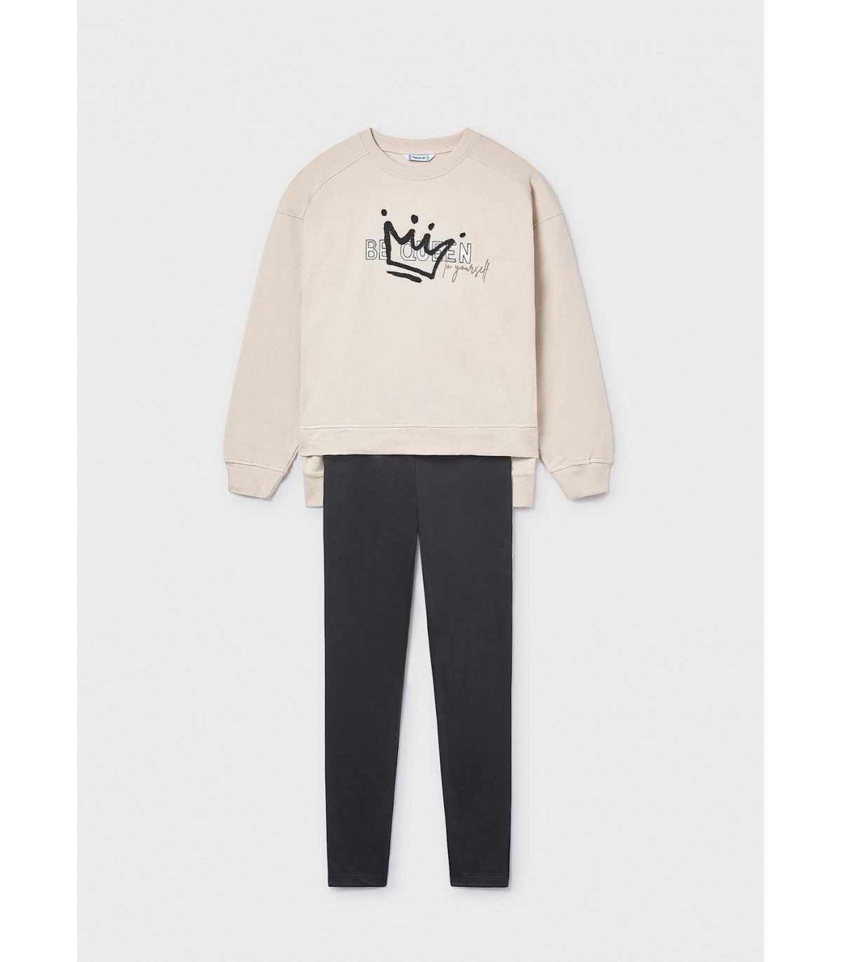 Conjunto de Mayoral compuesto por dos prendas. Sudadera con cuello redondo con dibujo con relieve en la parte delantera. Pantalón tipo legging simulando polipiel con cintura elástica.