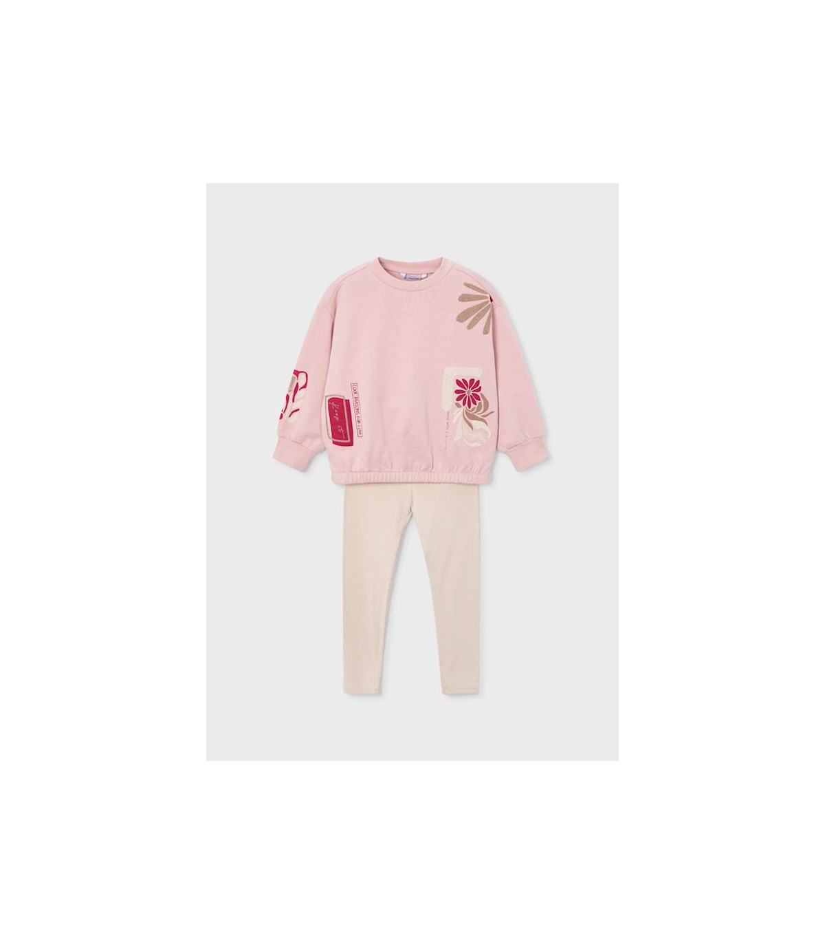 Conjunto de Mayoral compuesto por dos prendas. Sudadera con cuello redondo y bajo elástico para un mejor ajuste. Pantalón tipo legging con cintura elástica.