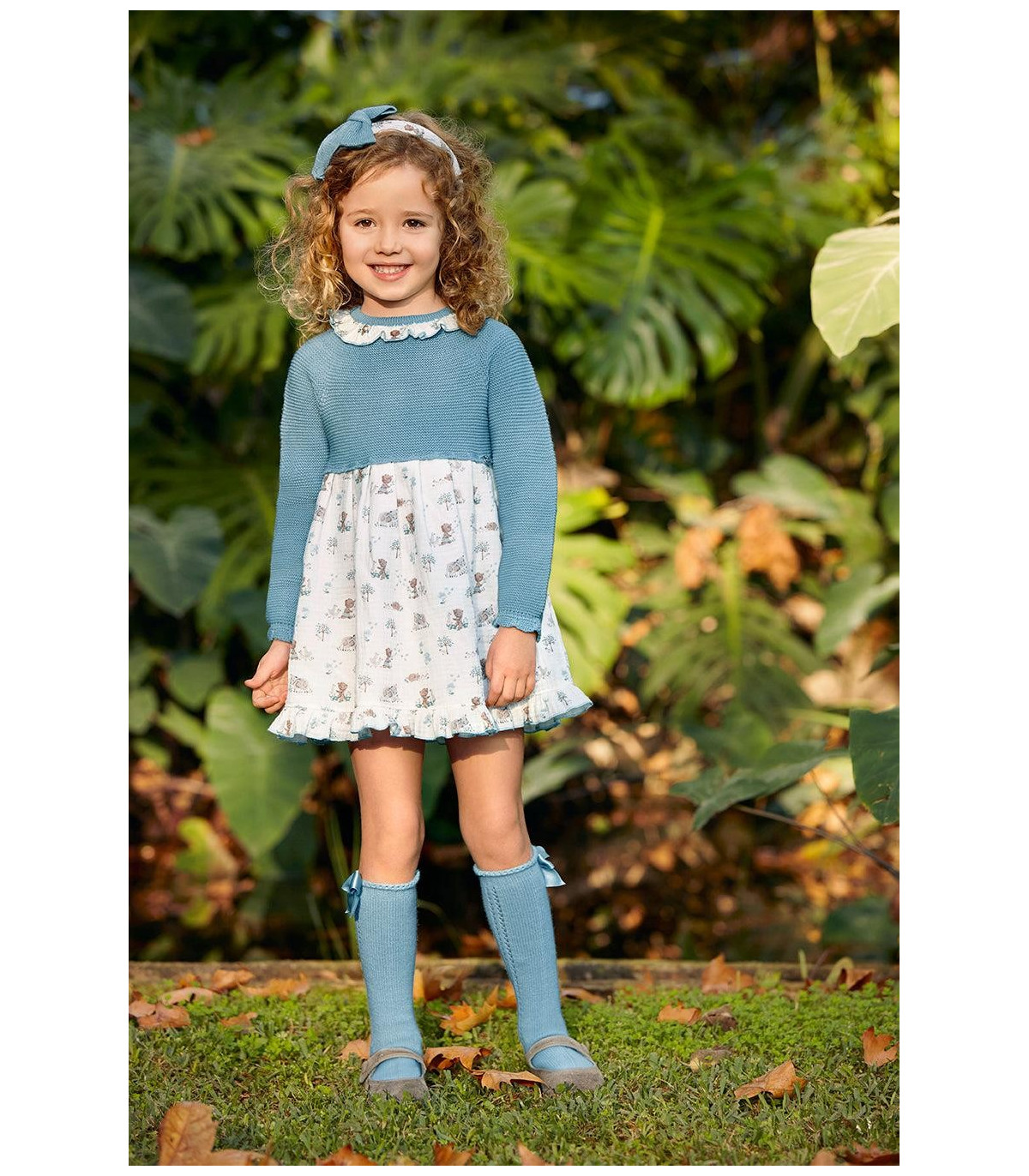 Vestido combinado pechero punto con cuello redondo con volante y falda estampada. Cierre central trasero con botones.