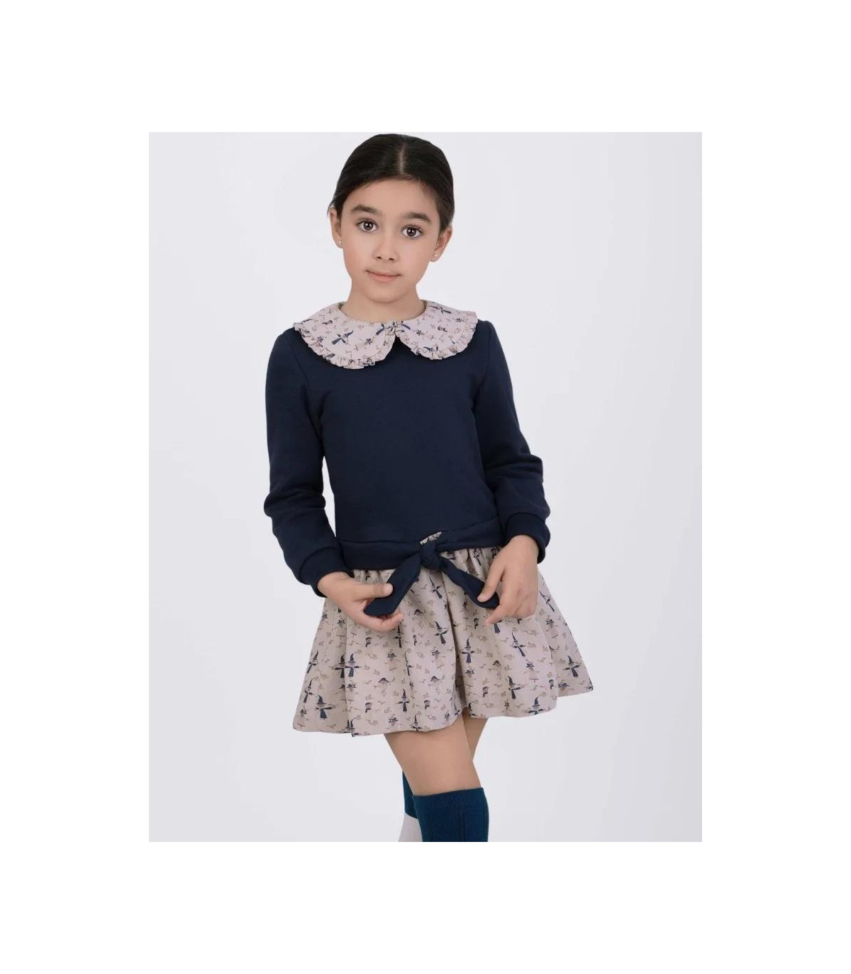 Vestido combinado talle en algodón con cuello redondo con cuello blusa y falda estampada. Cierre central delantero con botones.