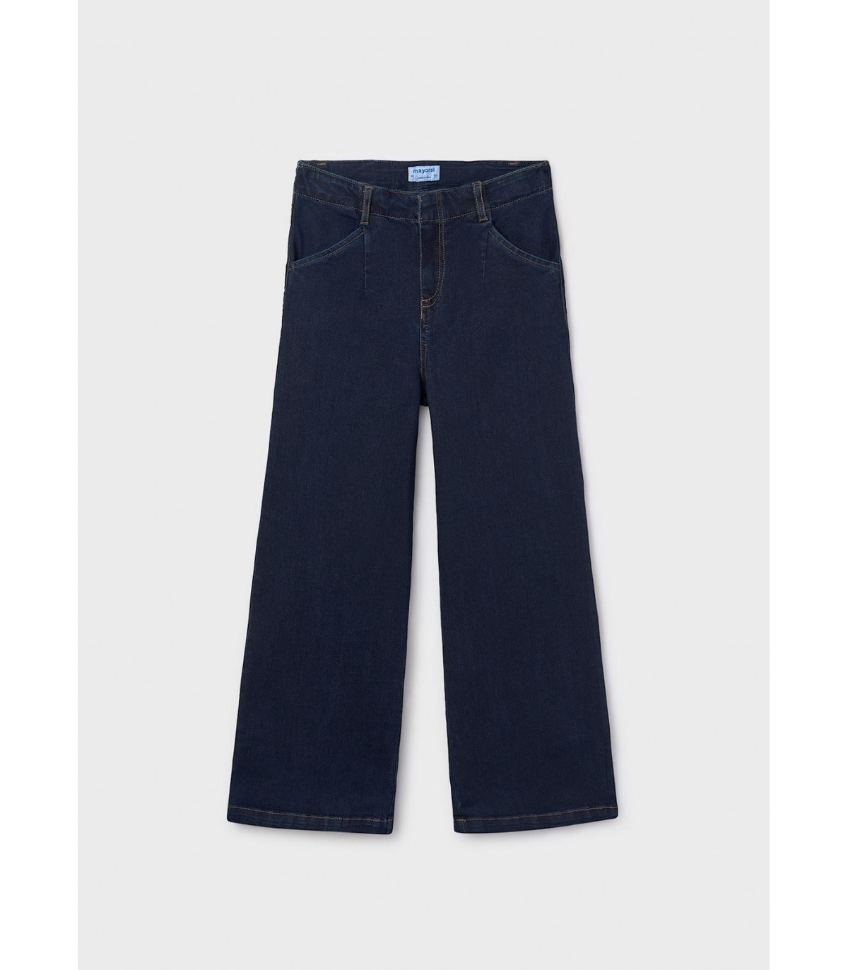 Pantalón de Mayoral tejano estilo acampanado con goma elástica regulable con botones en el interior de la cinturilla. Bolsillos funcionales en la parte delantera y trasera de la prenda.